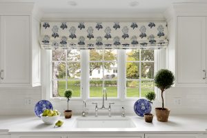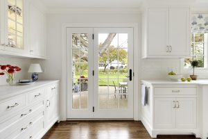 Over the next six months, Johnson and designer Mary Maney got to work bringing that vision to life. The wall separating the kitchen and dining room was removed, allowing space for an eat-in kitchen. Oak hardwoods add warmth to new white inset cabinets from Crystal Cabinet Works and Caesarstone quartz white matte countertops, while a built-in hutch displays fine china and doubles as serving space while entertaining. An expanded window over the sink—complete with a Rohl bridge faucet in polished nickel—looks into the backyard, which can now be reached by one of two Marvin patio doors that let in plenty of light.