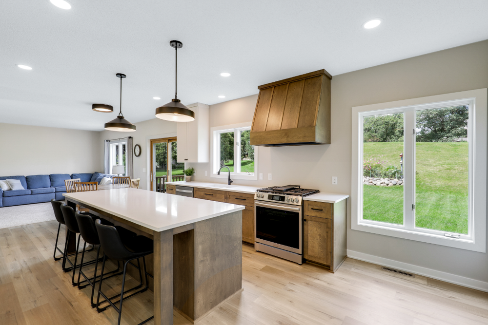 What truly sets this project apart is the way the homeowners chose to focus their budget on the spaces that would have the greatest impact. Rather than attempting to renovate the entire home at once, they invested in the kitchen—the part of the house where they spend the most time—to create a result that was genuinely transformative. This careful approach allowed them to prioritize meaningful upgrades: warm birch cabinetry that blends with the home`s existing honey oak trim, timeless quartz countertops, a custom birch range hood that serves as a beautiful focal point, durable luxury vinyl flooring that stands up to daily life, and solid-wood millwork that adds lasting quality throughout.