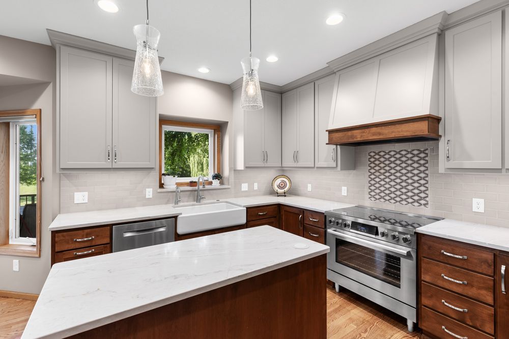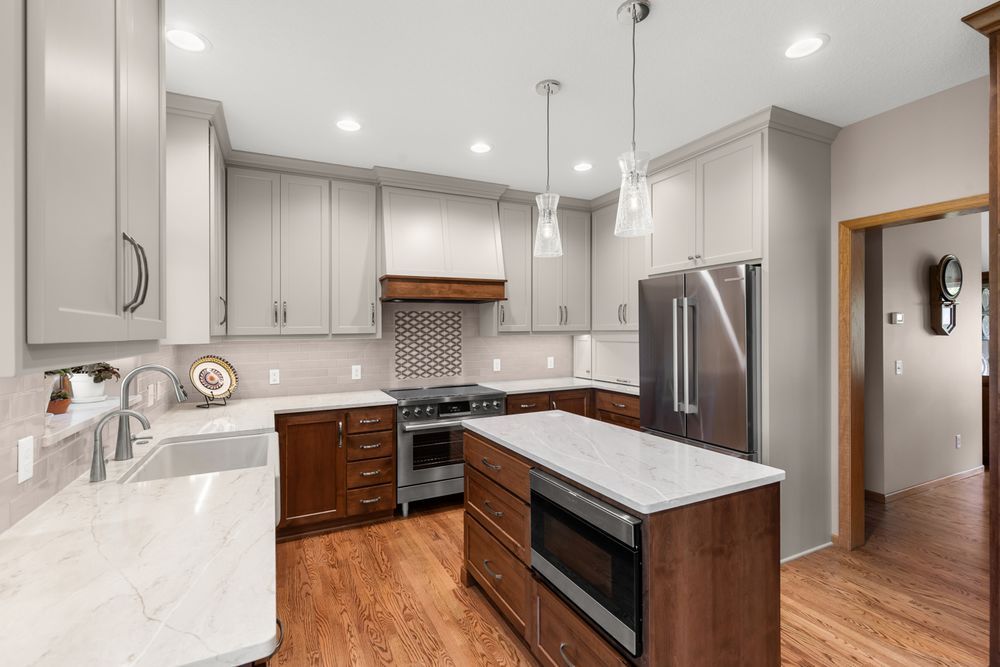 This stunning kitchen remodel blends modern functionality with personalized design to meet every need of the homeowner. The outdated corner pantry was removed to create a more open and efficient layout, with ample custom cabinetry providing purposeful storage throughout—including a dedicated utility cabinet and a cleverly integrated coffee station and pantry with pullouts. Not to be missed!