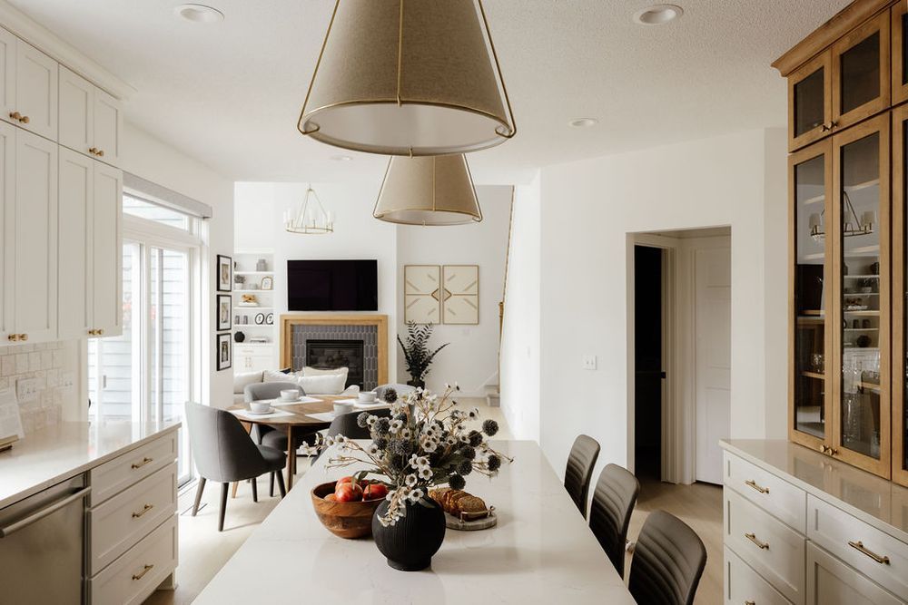 In the family room, we refreshed the existing built-in cabinetry with new paint and added a custom fireplace mantle that serves as a striking focal point. Every detail of this renovation was designed to increase comfort, improve flow, and make the home feel fresh and inviting. The result is a cohesive, thoughtfully designed space that honors the original structure while bringing it fully into the present.