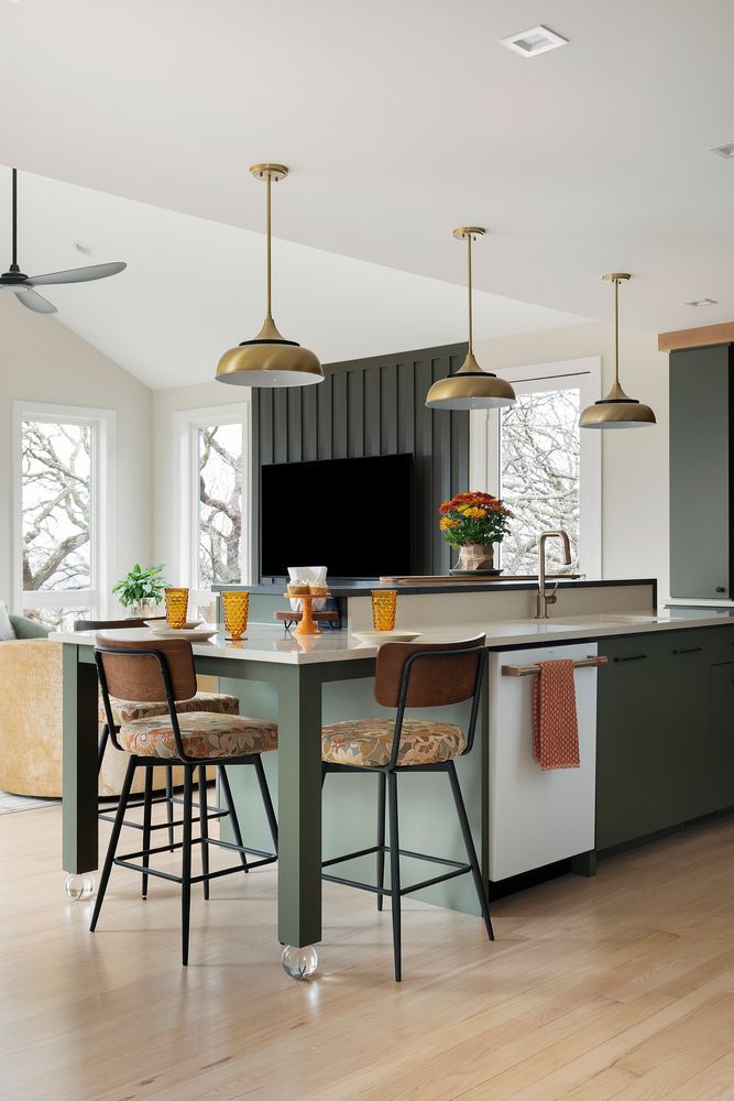 The stunning transformation of this 1942 home features a seamless main floor and kitchen remodel. By replacing an old addition with a new family room addition, the home now flows perfectly. The design showcases bold colors, custom bookshelves, a cozy fireplace, and a sleek bathroom, all centered around breathtaking Minnesota River Valley views. Modern living meets classic charm in every detail.