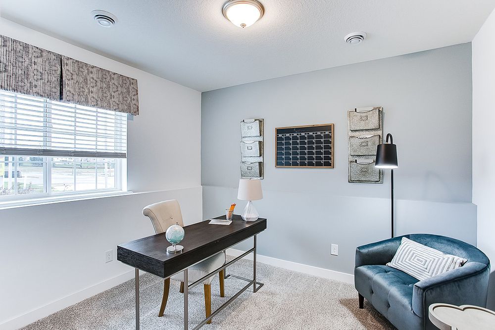 The Caledonia and Dalton townhome floor plans are a favorite for the study/flex room space, an open kitchen, dining and family room area. The kitchen is so spacious the island can seat up to four people at the breakfast bar. Styled with quartz countertops and stainless appliances, plus a pantry, the kitchen is a focal point of the townhome. The family room is next to the kitchen and offers an optional electric fireplace and sliding glass doors out to a deck.