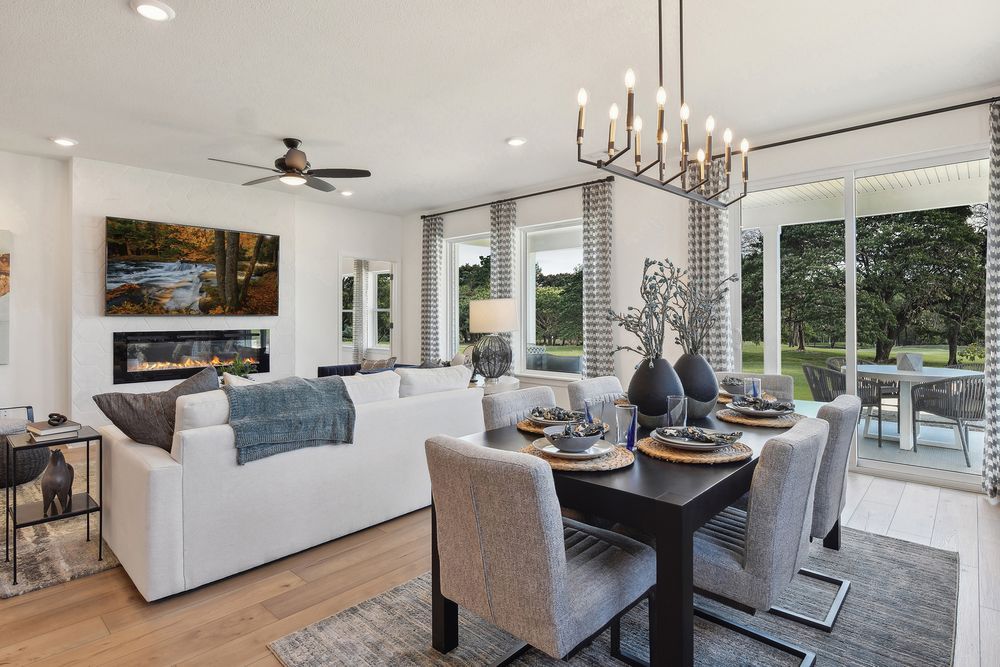 Inside, energy-efficient windows bathe the open-concept living area in natural light. The family room features a stunning white tile-accented electric fireplace wall and plush, modern furnishings that invite both conversation and relaxation. The adjacent dining space is wrapped in rich navy tones and anchored by a bold rustic industrial chandelier, perfect for everyday meals and holiday gatherings alike.