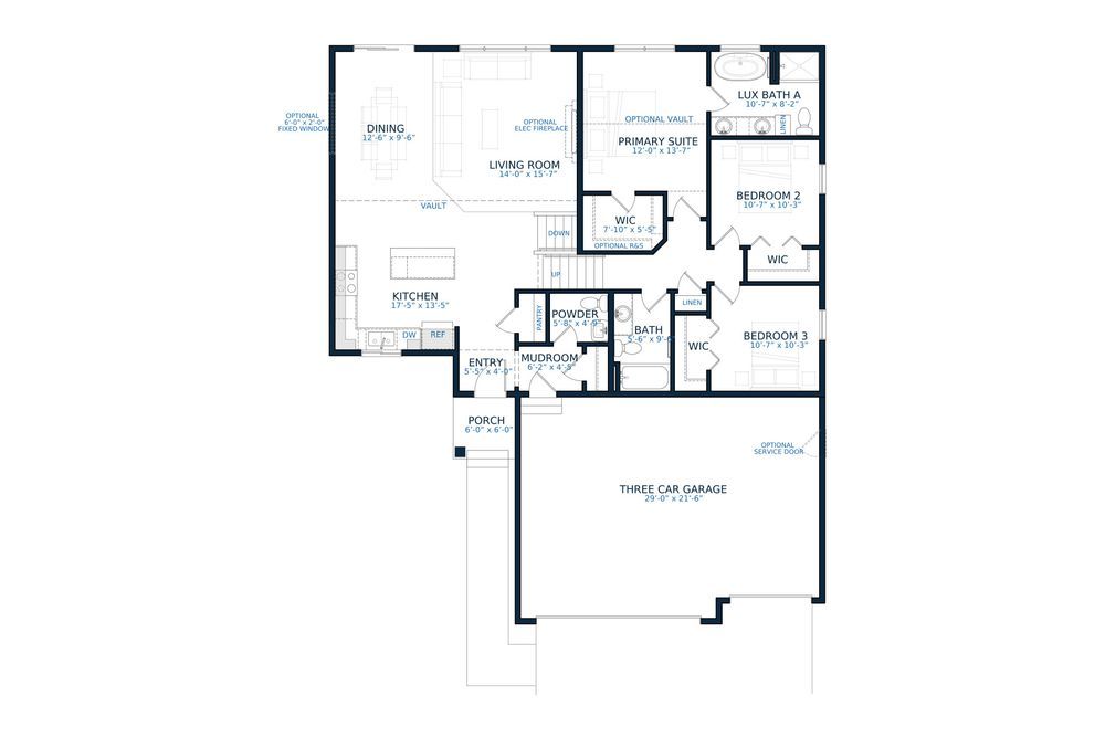 Upper Living offers a comfortable and private primary suite with an optional vaulted ceiling, walk-in closet, and a luxurious bathroom featuring dual vanities and a separate tub and shower. Two additional bedrooms, a full bathroom, and ample storage space complete the upper level, providing flexibility for family, guests, or home office needs.