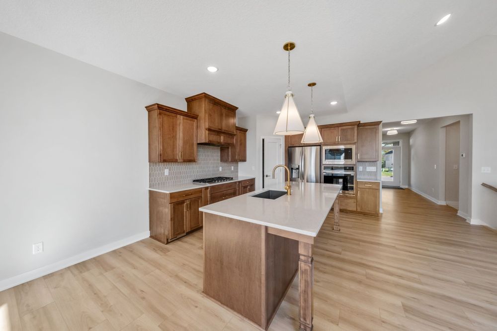 Welcome to our Clifton floor plan. This villa style home with basement is the perfect way to have all your living needs on one level. This home has two bedrooms on the main floor and if the basement is finished it would have a 3rd bedroom in the lower level. This home is stunning with a beautiful open great room, kitchen and dining area. The great room ceiling is vaulted which makes the entire main floor feel light and airy. A beautiful feature of this home is the sunroom and finished deck at the rear of the home. You can enjoy the sunroom 365 days of the year, and the deck is a perfect outdoor extension of living space in the warm months. The great room is anchored by an electric fireplace that adds cozy ambiance to the space. The owner`s suite on the main floor is spacious and connected to an ensuite bath with custom tile shower, dual vanities, and a soaking tub. This leads into the owner`s closet which is also connect to the main floor laundry room making washing day a breeze. This home is meant for elevated easy living.