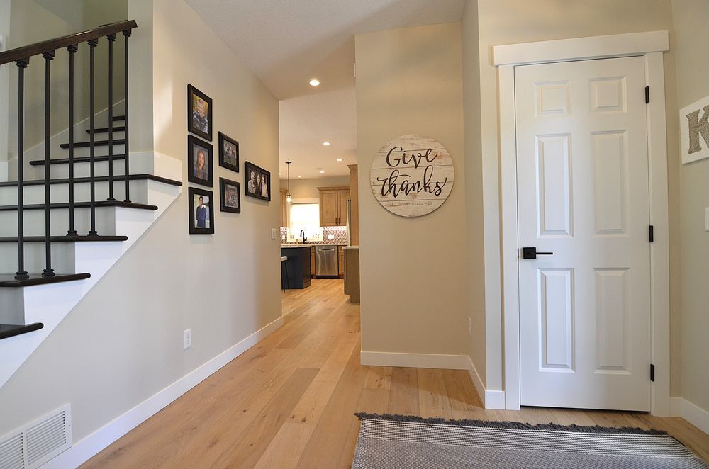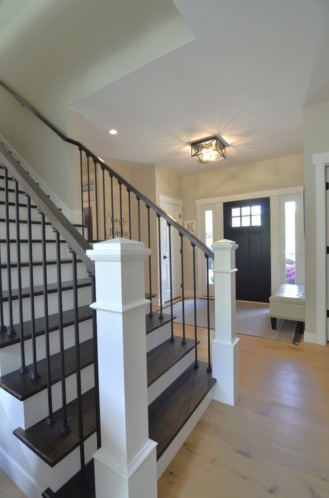 To create a seamless look across the main level, we replaced three types of flooring with wide-plank engineered hardwood. Trim and doors were updated with a clean, modern profile. The staircase received a striking upgrade with dark wood treads, black metal balusters, and crisp white accents for contrast.