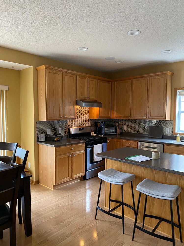 This remodel updated a honey oak kitchen and main level with an open layout, extended cabinetry, and a larger island. A built-in coffee bar replaced the pantry for added function. New engineered hardwood flooring, modern trim, and a refreshed staircase and front entry give the entire space a clean, cohesive look.