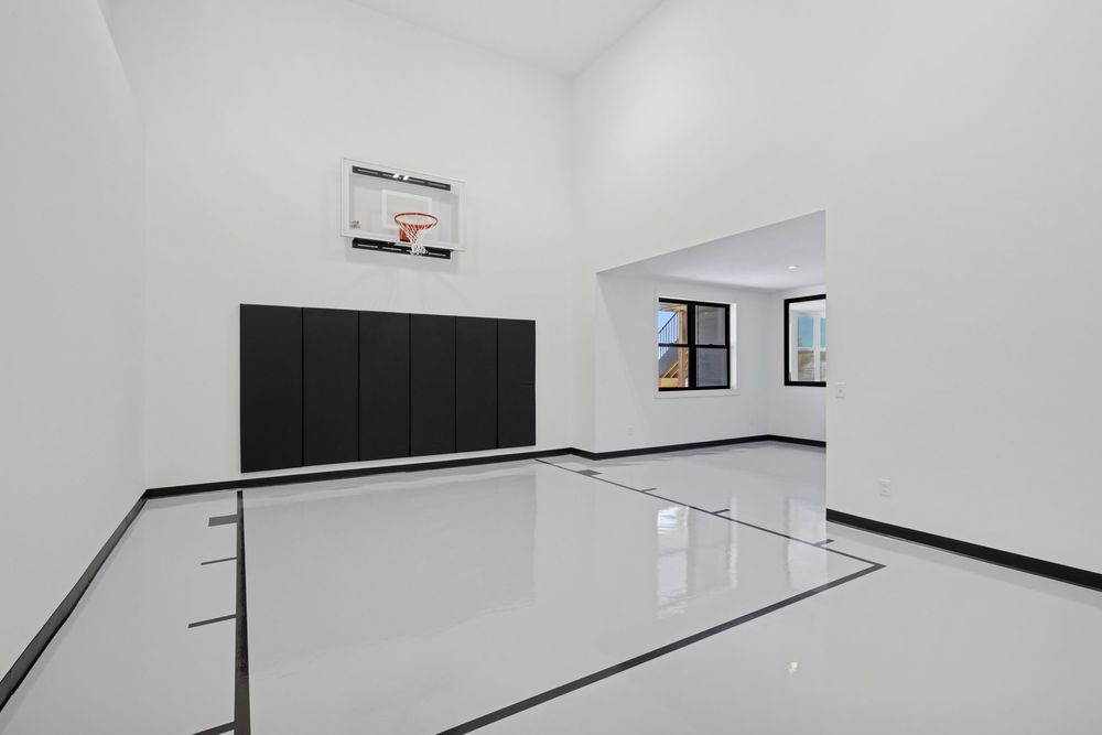Downstairs? A dream hangout with a full wet bar, rec room, athletic court, fitness space, and a fifth bed and bath.