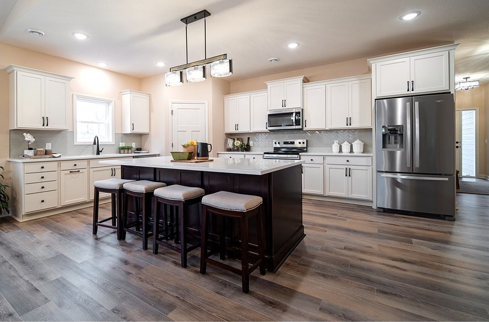 -Modern kitchen offers ample storage, painted white cabinets, quartz countertops, a massive island perfect for entertaining or casual meals. Whether you`re preparing a quick breakfast or hosting a dinner party, you`ll find everything you need to make cooking a pleasure.