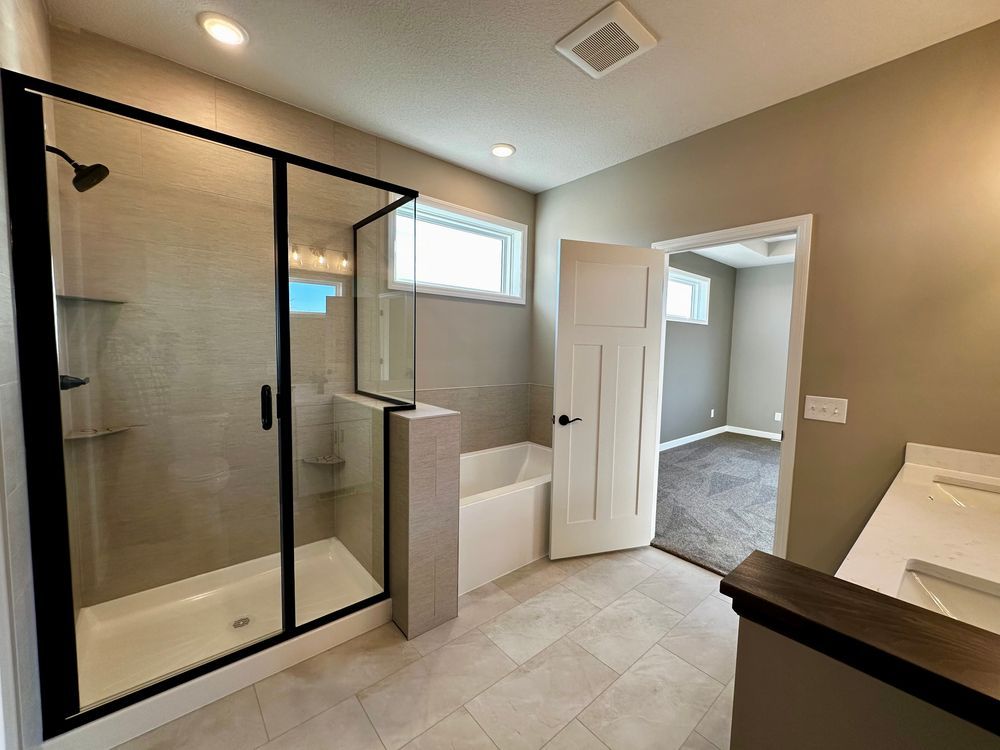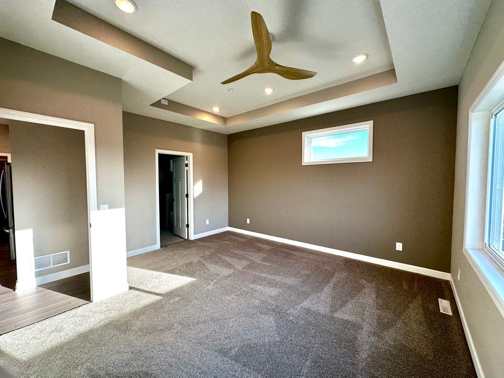 The main level owner`s suite features a boxed ceiling, large windows, and ensuite with double vanity, tile shower and separate tub, plus a spacious walk-in closet.