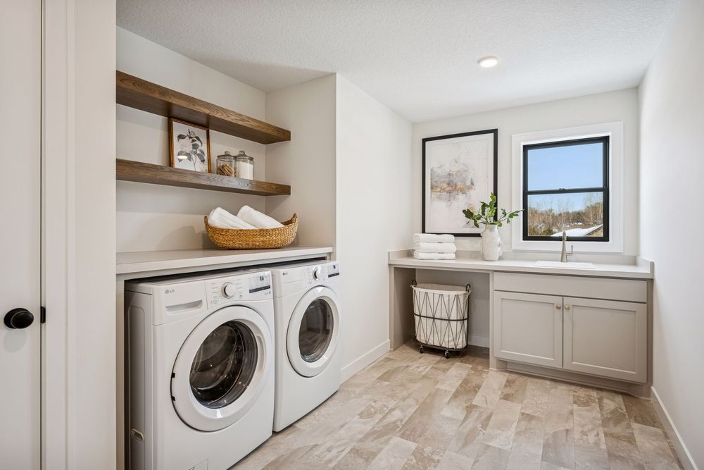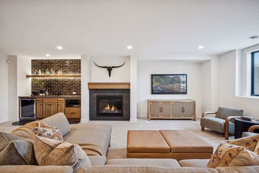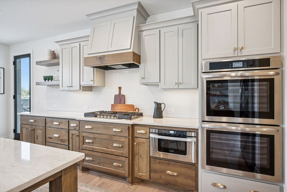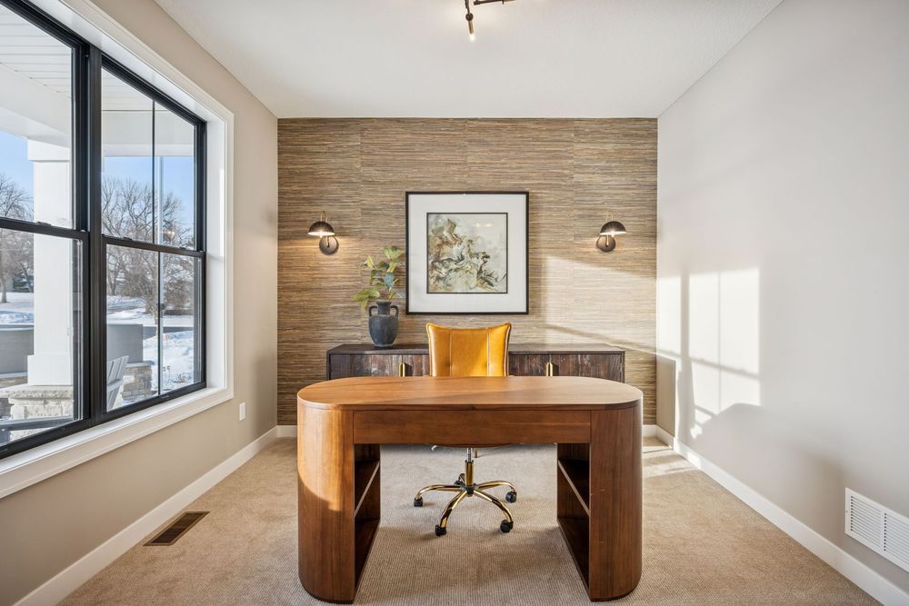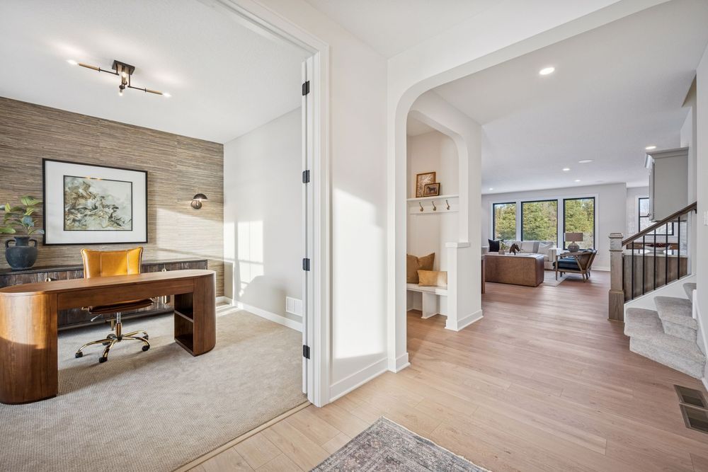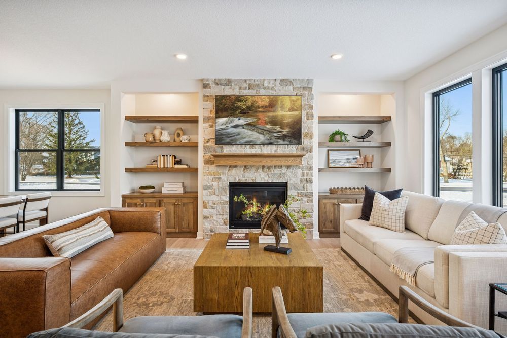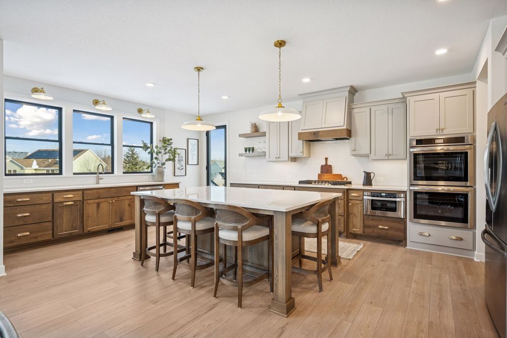 The home at 11470 19th St. NE in Riverview Preserve by Hanson Builders offers over 5,000 finished square feet, a 4-car garage, and a layout designed for everyday living. The main level centers around a kitchen with a large working island, generous cabinetry, and backyard views, flowing seamlessly into the great room with a striking stone-to-ceiling fireplace and built-ins. A walk-in pantry connects the garage to the kitchen for easy unloading, while the mudroom features built-in storage and a bench for busy family life. A private study near the front entry provides an ideal workspace.