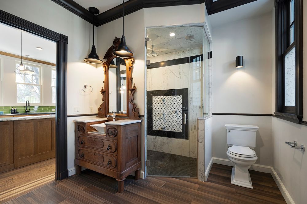 Built in 1890 in beautiful Cherokee Heights, this unique home had fallen on hard times. This remodel revitalized every inch inside, and put a substantial addition off the back of the home.. On the main floor, a barrier free en-suite was created with waterfall shower heads and steam! A full kitchen remodel with plentiful counterspace, new hardwood floors with inlay to replicate the original.