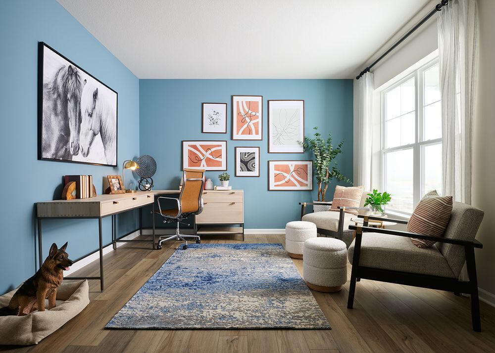 A private study with soothing blue walls and double workspaces creates an ideal zone for productivity or homework, enhanced by elegant artwork and plenty of natural light.