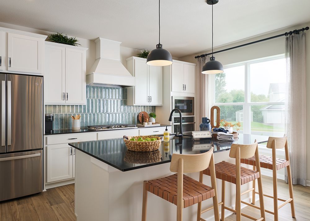 At the heart of the home, a beautifully appointed kitchen features creamy white cabinetry, statement pendant lighting, and a center island that seamlessly connects to the dining area and living room. A vertical subway tile backsplash and deep-toned flooring lend an elevated, cohesive aesthetic.
