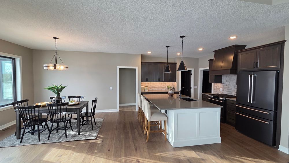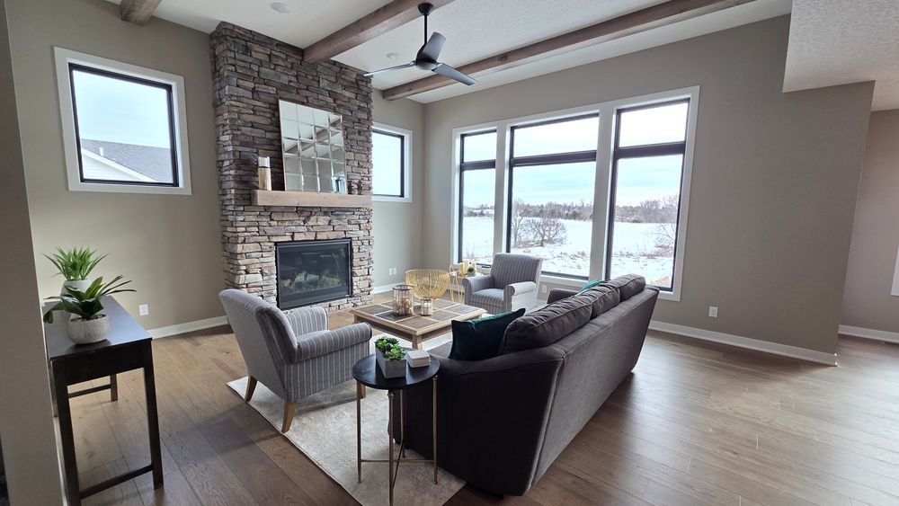 This warm and inviting custom 4-bedroom rambler will feel like home from the moment you walk in. Spacious living area features great room with 11.5’ beamed ceiling, stone fireplace, and wall of Andersen windows that overlook wetlands. The Owner’s Suite includes raised bedroom ceiling, walk-in tile shower, and closet with custom organizer system and connected laundry room. The kitchen features a large island and a spacious walk-in pantry. The main level study, just off the foyer, includes glass doors. The finished walkout lower level includes a family area and a game area with a built-in wet bar, 3 bedrooms, bath, a finished flex room, and additional storage areas. Custom cabinetry and detailed craftsmanship throughout. Spacious insulated and finished 3 car garage, concrete rear patio and driveway, landscaping, irrigation, and much more.