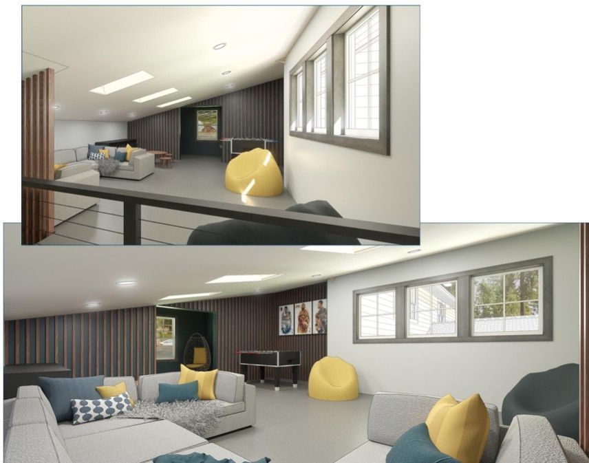What began as a single recreation space evolved into a thoughtfully designed, two-level addition that delivers far more than a court. The upper level expands the experience with a kitchen, sleeping nook, game room, and TV lounge, making it easy to transition from high-energy play to relaxed gathering. Two oversized garage doors open directly to a new patio, creating a seamless indoor-outdoor connection and extending the space beyond the walls.