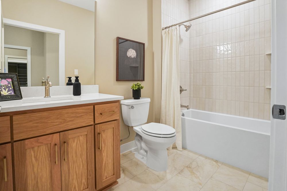 The main level also includes a conveniently located laundry room near mudroom entry for added ease. The primary suite offers a peaceful retreat, complete with dual vanities, ample counter space, a sleek ceramic tile shower, and a walk-in closet. An additional bedroom and full bath on the main level provide comfort and flexibility.